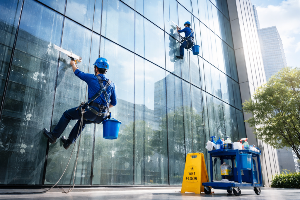 Großflächen und moderne Glasfronten reinigen wir effizient, sicher und mit speziellem Equipment – auch in größeren Höhen.
